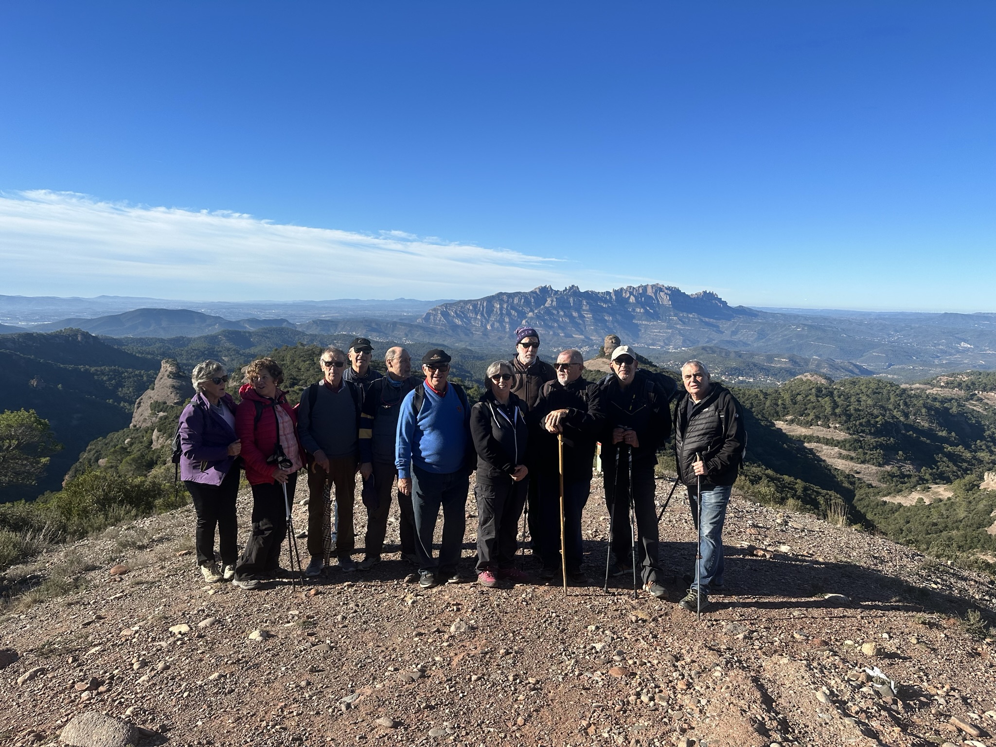El passat dimecres 8/11/2023 tal com estava programat ens trobem al pàrquing de l’Alzina del Salari un grup de 12 companys, decidits a fer una caminada de quatre hores . La puntualitat impecable, salutacions i moltes ganes de començar. Esteban, el nostre guia dona el tret de sortida decidint la via més adient per iniciar-nos. Un camí pedregós com tots els que podem trobar-nos en tot el parc natural de Sant Llorenç del Munt i l’Obac. A poc a poc notem la pujada i per alleugerir en Esteban s’endinsa al bosc per un camí estret que tots fem en” fila índia” i així fins al Coll de tres Creus. Aquí ens adonem que som en un lloc privilegiat, amb vistes fins al Mediterrani on el sol dona un gran reflex , matinar ha valgut la pena. Enfront tenim el massís de Montserrat i el Pla de Bages. Seguint les indicacions d’en Esteban ens marca l’objectiu de la nostra sortida, arribar al “paller de tot l’any” un petit turó en forma de paller just davant nostre, i cap allí marxem de nou. Seguim un camí estret dins d’un bosc on gaudim de la vegetació autòctona amb molta olor de farigola, romaní… i algú més agosarat fins i tot menja “cireretes de pastor “que ja comencen a madurar, i així tot carenant ja som a la base del “paller de tot l’any” 817 m (turó que la seva agulla recorda la forma d’un paller). Uns quants van rodejar-lo per la base seguint un petit camí. Hem arribat al punt de fer una breu aturada per esmorzar. De retorn pel mateix camí d’anada, i ens tornem a replegar just davant el ”Turó de la Pola” 930 m punt molt visitat pels excursionistes del parc per ser el segon turó més alt de la zona, es comenta que allí hi ha un punt geodèsic. Esteban com a bon guia ens proposa les diferents vies de retorn i tots a una li diem – tu mateix!! Un camí ample amb una baixada suau ens porta al punt de sortida. Hem caminat uns 10 km. Tot seguit completem la sortida amb un dinar al restaurant Pedritxes, punt on ens reunim amb nou companys que s’afegeixen al dinar. Un bon dinar i molt bona companyia ens anima a fer noves sortides a caminar pel nostre entorn. Hem completat la sortida amb un dinar al restaurant Pedritxes, punt on ens reunim amb nou companys que s’afegeixen al dinar. Un bon dinar i molt bona companyia ens anima a fer noves sortides a caminar pel nostre entorn.